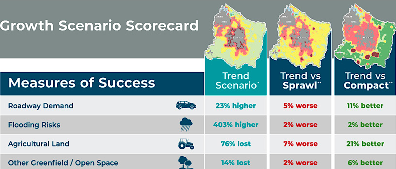 A portion of a “Growth Scenario Scorecard” from PlanRutherford showing outcomes of the likely trend scenario, with “Sprawl” and “Compact” scenarios based on land-use decisions. (PlanRutherford, Public Domain)
